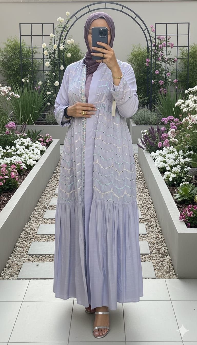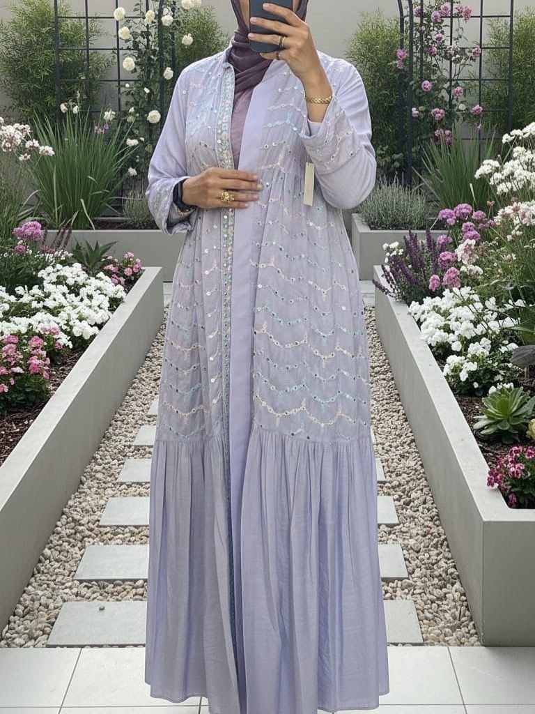 عباية لافندر جاردن هي تعبير عن الرقة والجمال المستوحى من ألوان اللافندر الهادئة. تأتي بلون بنفسجي فاتح يمنح إطلالة ناعمة، وتتميز بتطريز متموّج ينساب على القماش ليعكس الهدوء والحركة الانسيابية.